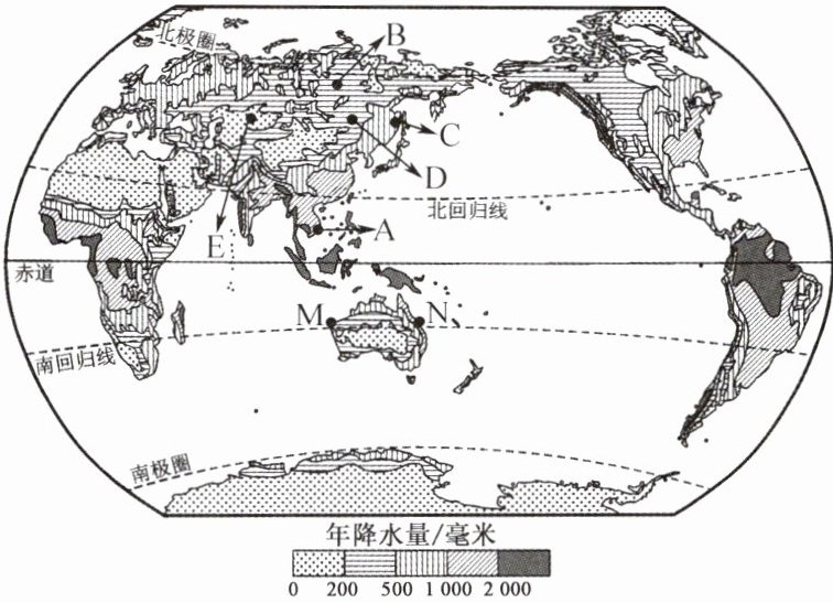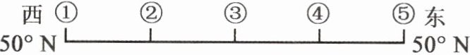 D(提示:$50^{\circ }N$一线地处北半球中纬度地区,穿过亚欧大陆。该线沿海地区降水较多,内陆地区降水较少,因此亚欧大陆所处中纬度地区自西向东降水的变化规律是多→少→多,即年降水量自③向东西两侧逐渐增多)