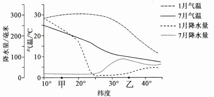 14.D(提示:读图可知,图中7月气温低于1月气温,因此该图示意的是南半球的气候。与乙地相比,图中甲地的降水量季节变化较大,气温年较差较小。图中1月降水量在25°S附近时最少,7月气温自北向南递减) 15.B(提示:图中甲地地处热带,降水分为明显的干、湿两季,为热带草原气候;乙地地处30°S—40°S之间,雨热不同期,为地中海气候)