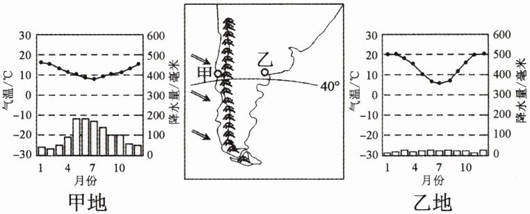 (区域认知)小武某年8月前往南美洲的甲、乙两地探险,领略当地的自然风光。读甲、乙两地的地理位置和气候资料图,完成11—12题。