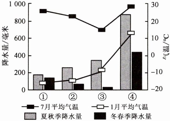 10. (综合思维)下图为我国南宁、呼和浩特、拉萨和乌鲁木齐四个城市的气候资料图,图中③城市7月平均气温最低,主要影响因素是(