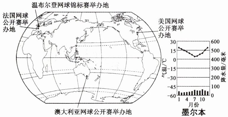 A(提示:读图可知,澳大利亚网球公开赛的举办地墨尔本位于南半球,每年1月南半球处于夏季,墨尔本属温带海洋性气候,此时墨尔本气候温和湿润,适宜举办网球比赛)
