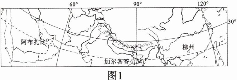 材料一 图1为阿布扎比、加尔各答、柳州三个城市的位置示意图。