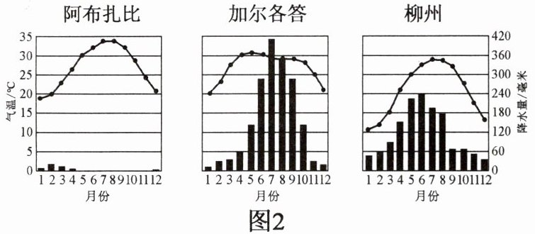 材料二 图2为阿布扎比、加尔各答、柳州三个城市的气温年变化曲线和各月降水量柱状图。