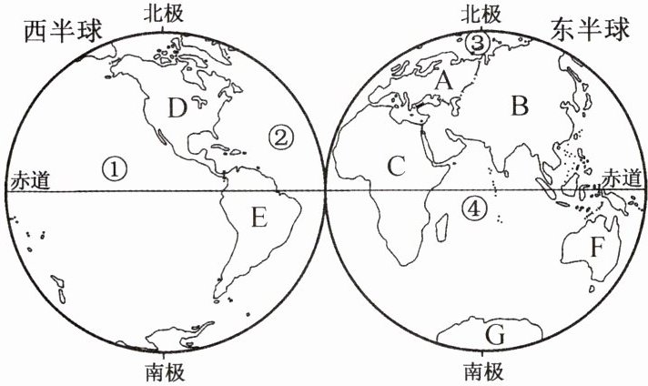 12. (黑龙江佳木斯中考)读东西半球示意图,完成下列各题。
