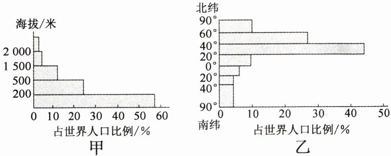 9. 根据人口在不同纬度地区的分布情况(乙图)推断,世界人口稠密的地区主要分布在(