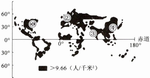 (综合思维)世界人口的分布很不均匀,但又有一定的规律性。读下面两幅图,完成8—9题。