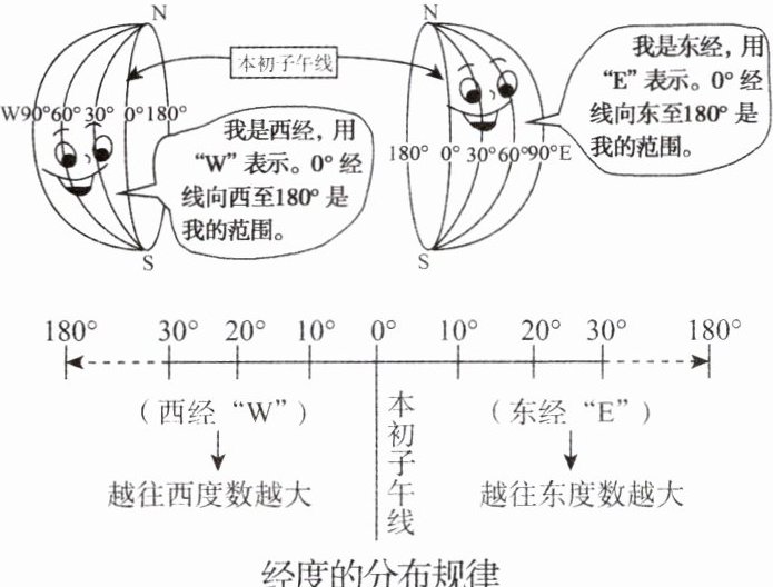 (4)规律:以 $0^{\circ}$ 经线为界,经度向东增大为