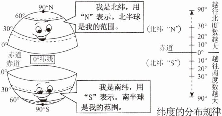 是最大的纬线圈,即 $0^{\circ}$ 纬线,它把地球平分为南、北两个半球。人们为纬线标定的度数,叫纬度。2. 纬线的特点