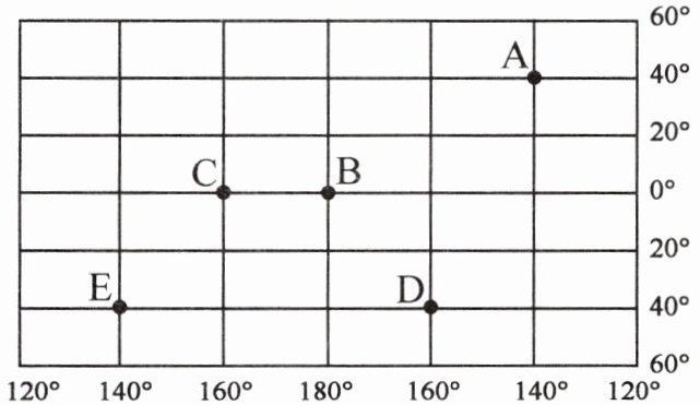 )A.A 地的经纬度是 $(40^{\circ}N, 140^{\circ}E)$
