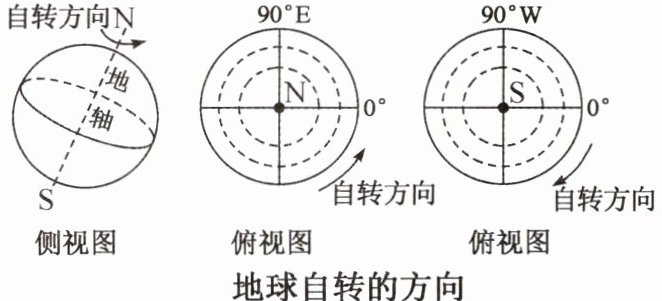 时针方向自转;从南极上空俯瞰,地球呈顺