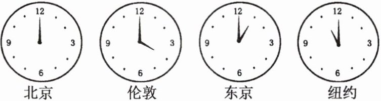 暑假,小明开启了北京之行。入住酒店时,他发现大堂墙上四个城市的钟表时间不同。读图,完成 6~7 题。