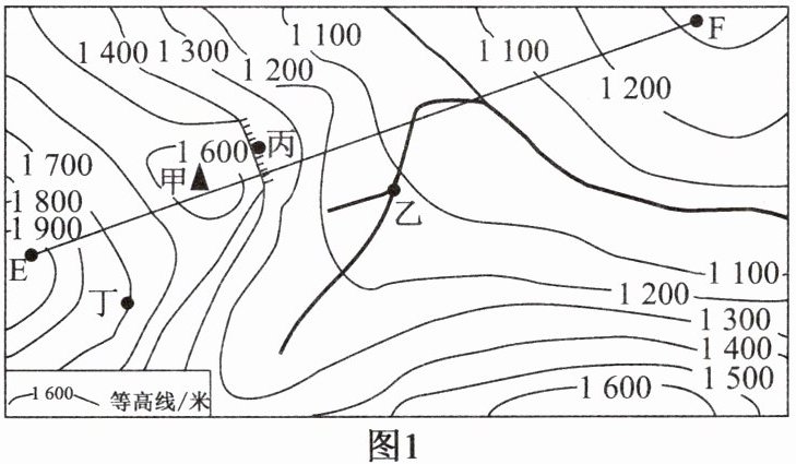 11.C(提示:图2中的藤梯位于陡崖部位,图1中丙处等高线重叠,为陡崖) 12.B[提示:结合图示来看,E-F线经过的区域地势起伏较大,E处的海拔高于F处,从E处至F处海拔先是降低(途中经过山峰和陡崖),直至下降到1100米以下,然后再升高]