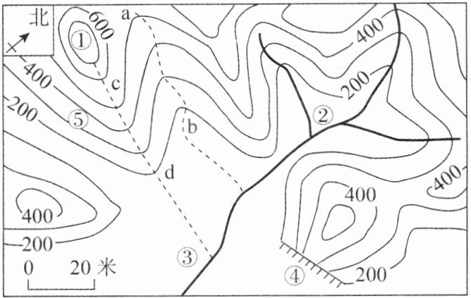 16. 下图为小亮户外活动区域的局部等高线地形图。有关下图的叙述,正确的是(