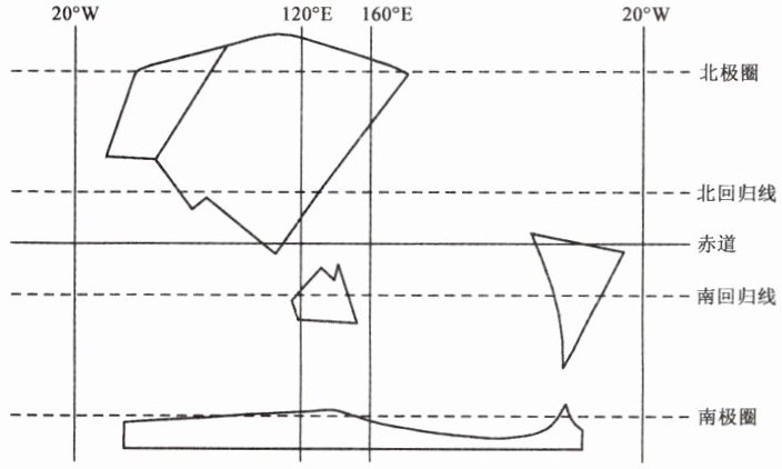 下图为某同学绘制的世界简笔地图,观察其中已完成的各大洲地理位置、形状特点和面积大小,请你替他完善此图。