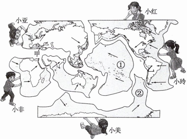 (4)小红和小玲推动手上的板块,使其与①②板块相互碰撞挤压,在乙处形成了世界上最长的山脉——