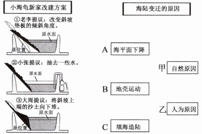 (2)造成海陆变迁的原因与小海龟新家改建的方案有些相似,请连线并构建正确的逻辑关系。