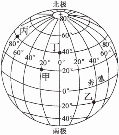 7.B[提示:所有经线长度均相等;乙地的坐标为(20°S,40°E);丙、丁两地的纬度相同,经度不同;丁地的经度为0°,位于东西经度的分界线上] 8.C