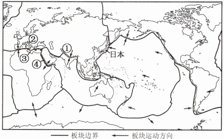 2024 年 1 月 1 日,日本本州岛西岸近海海域发生 7.4 级地震,震源深度为 59 千米。日本是地震多发的国家,危害较大的地震平均每 3 年就要发生 1 次。读全球板块分布示意图,完成 14~15 题。
