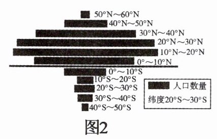 (2)读图 2 可知,世界人口主要分布在南北半球中的