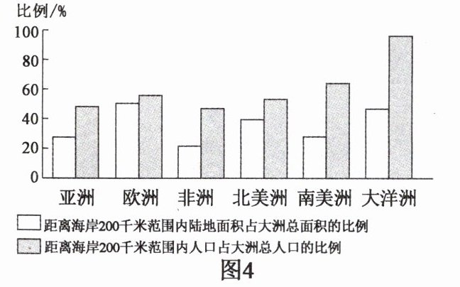 (4)读图 4 可知,距离海岸 200 千米范围内陆地面积占大洲总面积比例最大的大洲是