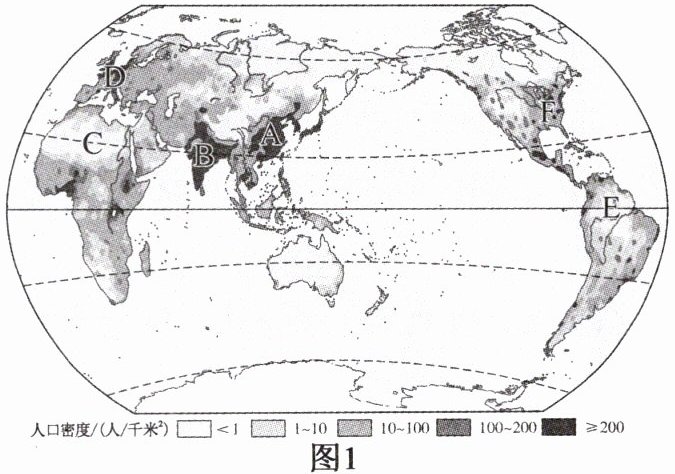 (填数字序号)四地是世界人口稠密的地区。(2)读图 2 可知,世界人口主要分布在南北半球中的