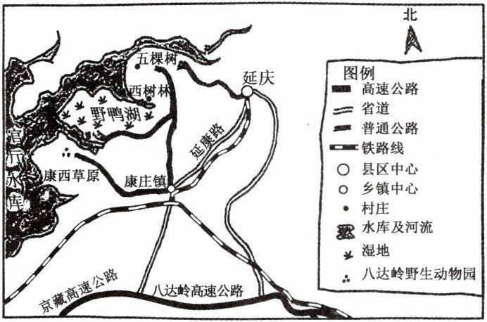 (1)同学们根据收集到的资料手绘了野鸭湖及周边地区示意图(如上图所示),利用这幅图,我们可以获取的地理信息有