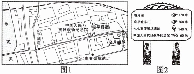 某中学组织学生赴北京研学,参观中国人民抗日战争纪念馆。图 1 为纪念馆周边地区示意图,图 2 为该校地理兴趣小组绘制的指示牌。读图,完成 9~11 题。