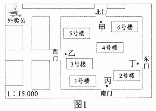 12. 外卖员要去该小区 2 号楼送餐,当他骑行至图 1 中位置时,需步行至 2 号楼,其步行路线在图上长约 6 厘米,若他保持 100 米/分的速度步行,大约需要步行(