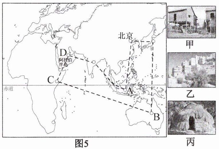 探究过程中,同学们设计了“环游东半球”的网络模拟学习活动。模拟路线从我国北京出发,具体路线如下图所示。通过收集、分析资料,同学们发现了很多独具特色的民居。图 5 为网络模拟学习活动路线及沿途的特色民居。