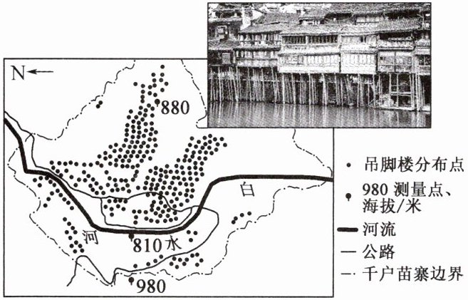 西江千户苗寨位于贵州黔东南谷地,层层错落的木质吊脚楼依山而建,呈阶梯状逐级抬升,与自然和谐共融,成为名副其实的“生态建筑”。读西江千户苗寨吊脚楼分布和吊脚楼景观图,完成3~4题。