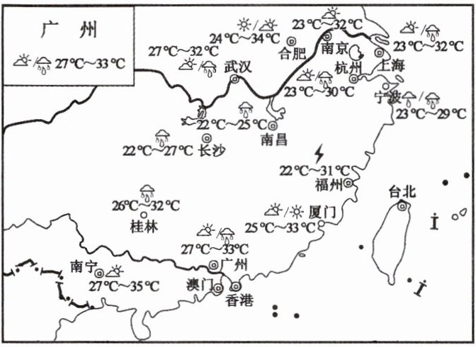14. 读我国东南部地区部分城市某日天气状况图,完成下列各题。