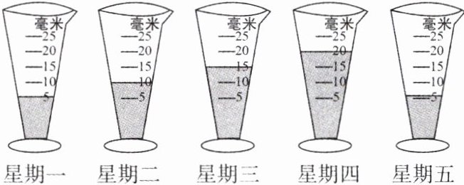 降水量一般用雨量器来测量。小黄同学参观完气象站后,在家里使用同一个雨量器,测量了星期一至星期五的降水量(如下图所示)。