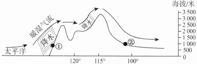 读沿40°N纬线北美洲局部地形剖面图,图中曲线箭头示意气流运动方向。据此,完成第13题。