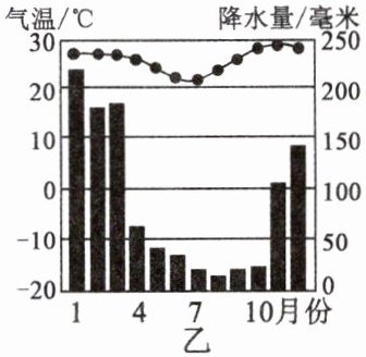 9. 与甲地相比,乙地的气温或降水的突出特征是(