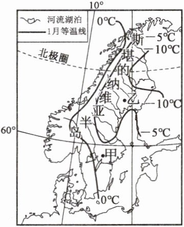 读斯堪的纳维亚半岛1月平均气温分布图,完成6~7题。