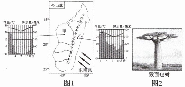 10.C(提示:读图可知,该岛屿的盛行风向为东南风,甲地主要位于东南风的背风坡,降水偏少,形成热带草原气候;乙地位于东南风的迎风坡,降水较多,形成热带雨林气候,故地形地势是造成甲、乙两地气候差异显著的主要因素) 11.A(提示:根据材料可知,猴面包树分布在干湿季分明的地区,甲地属热带草原气候,干湿季分明;乙地属热带雨林气候,终年高温多雨,故猴面包树分布在甲地。图2中的猴面包树此时树叶茂密,说明其拍摄于湿季,甲地12月到次年2月降水较多,为湿季,A项符合题意) 12.D