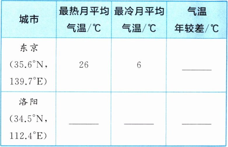 探究二 海陆分布——探究同纬度沿海和内陆地区的气温差异。东京、洛阳均位于35°N附近,与靠近太平洋的东京相比,洛阳距离海洋较远。