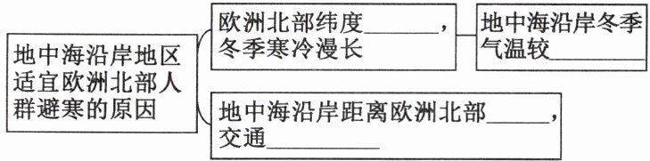 (2)欧洲北部地区1月外出避寒人数众多,且地中海沿岸是大部分欧洲北部地区居民向往的避寒区。结合所学知识,完成下图。