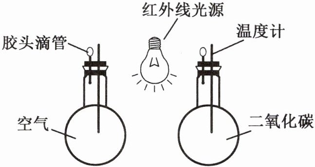 材料二 小实验:在两只烧瓶中分别充满二氧化碳和空气,塞紧带有温度计和胶头滴管的橡皮塞。再把两只烧瓶放在红外线下照射,观察气温变化情况。最终得出结论:两只烧瓶在相同红外线的照射下,充满二氧化碳的烧瓶气温较充满空气的烧瓶气温高,二者最大温差可达4℃。