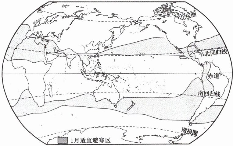 (1)世界1月适宜避寒区呈条带状分布,产生该现象的主要因素是