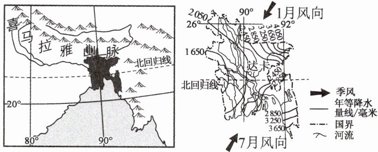 19. 结合图示和所学知识推测,影响孟加拉国年降水量分布的主要因素有(