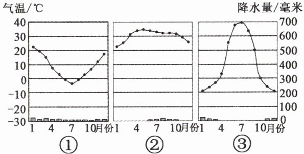(2)下图中,表示撒哈拉沙漠、卡拉库姆沙漠、巴塔哥尼亚沙漠三地气候的数字序号依次是