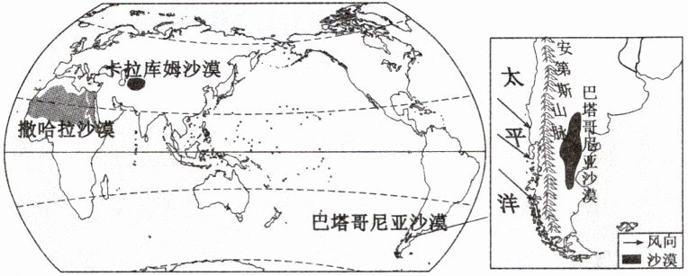 (填“东”或“西”)侧。(2)下图中,表示撒哈拉沙漠、卡拉库姆沙漠、巴塔哥尼亚沙漠三地气候的数字序号依次是