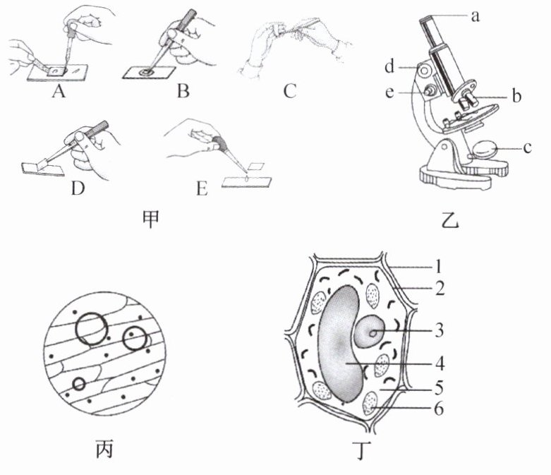 (4)装片制作完成后置于显微镜下观察,若发现如图丙所示的视野,则可能是由于图甲中的[ ]操作不当。为了避免这种情况的发生,应按照图戊中的( )(填下列字母)进行正确操作。