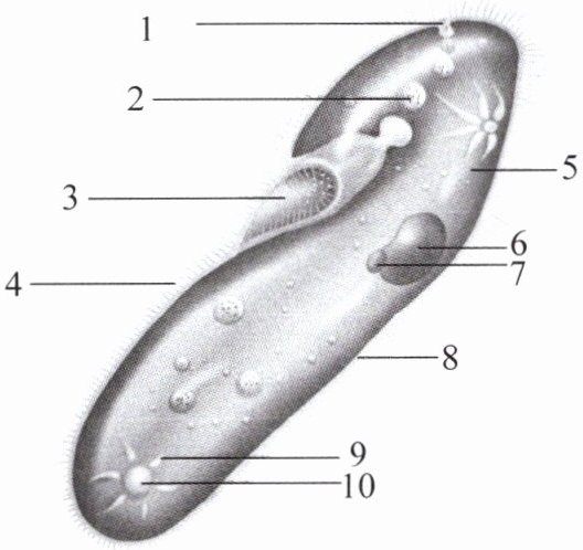 (2)4纤毛 8表膜 3口沟 2食物泡 1胞肛 8表膜 9收集管 10伸缩泡 分裂
