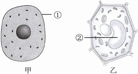 B 【提示】甲为动物细胞,结构有①细胞膜、细胞质、细胞核、线粒体;乙有细胞壁、细胞膜、细胞质、细胞核、线粒体、叶绿体、②液泡,故其是植物细胞;细胞的控制中心都是细胞核。