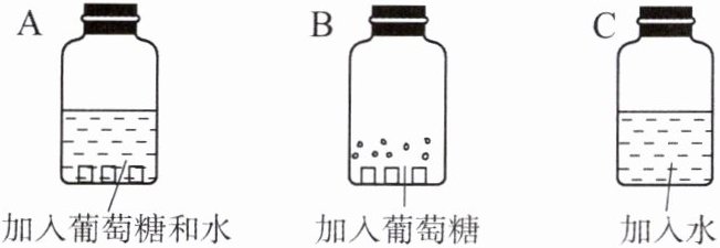 9. [跨学科实践]某课外活动小组的同学想探究酵母菌生长繁殖所需要的条件,他们设计了一组实验(如下图所示)。室温下,在 A、B、C 三个玻璃瓶中均加入等量的酵母菌,并放在相同的环境中。请按要求回答下列问题。