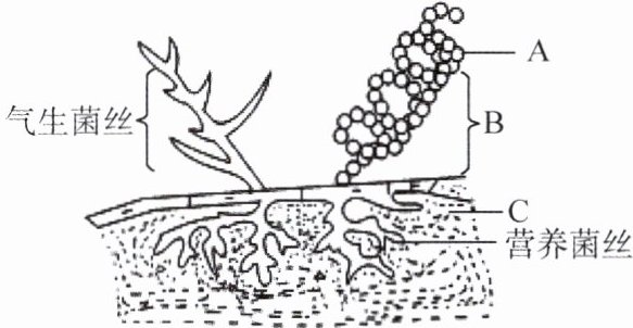 (4)B【提示】真菌细胞的基本结构有细胞壁、细胞膜、细胞质、细胞核等,没有叶绿体。真菌有单细胞的,如酵母菌;也有多细胞的,如霉菌等,其中霉菌和蘑菇等大多是由大量的菌丝组成的,菌丝上面能产生大量的孢子。真菌大小不同,形态各异。图中A是孢子,B是孢子丝,C是营养基质。