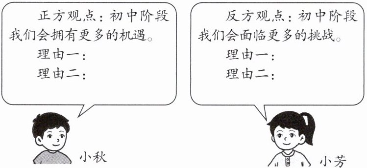 金秋九月,七年级学生小秋和小芳来到了新的学校,开始了初中生活。面对新变化,小秋和小芳进行辩论。小秋认为:“初中阶段我们会拥有更多的机遇。”小芳则认为:“初中阶段我们会面临更多的挑战。”