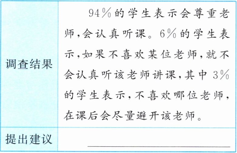 |调查结果|94%的学生表示会尊重老师,会认真听课。6%的学生表示,如果不喜欢某位老师,就不会认真听该老师讲课,其中3%的学生表示,不喜欢哪位老师,在课后会尽量避开该老师。|